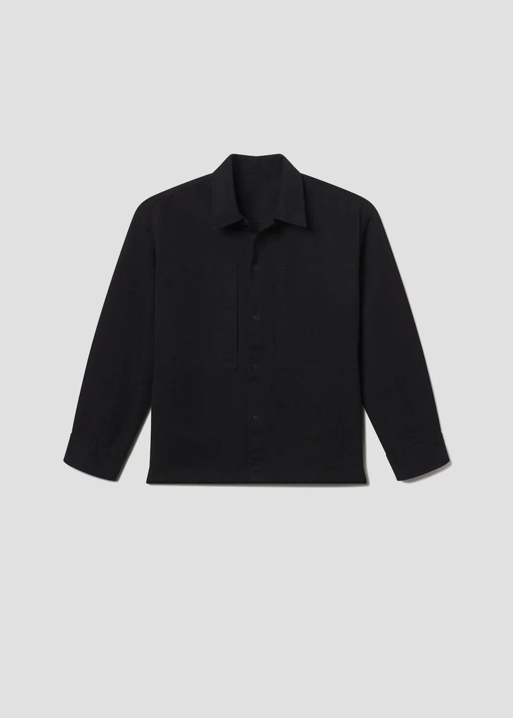 Introducing the Agolde Rhode Overshirt in Black Black, a modern utility shirt jacket designed for functionality and style. This piece is crafted from garment-dyed polished twill, providing a sleek and sophisticated look. The rigid twill fabric ensures durability while maintaining a classic aesthetic.