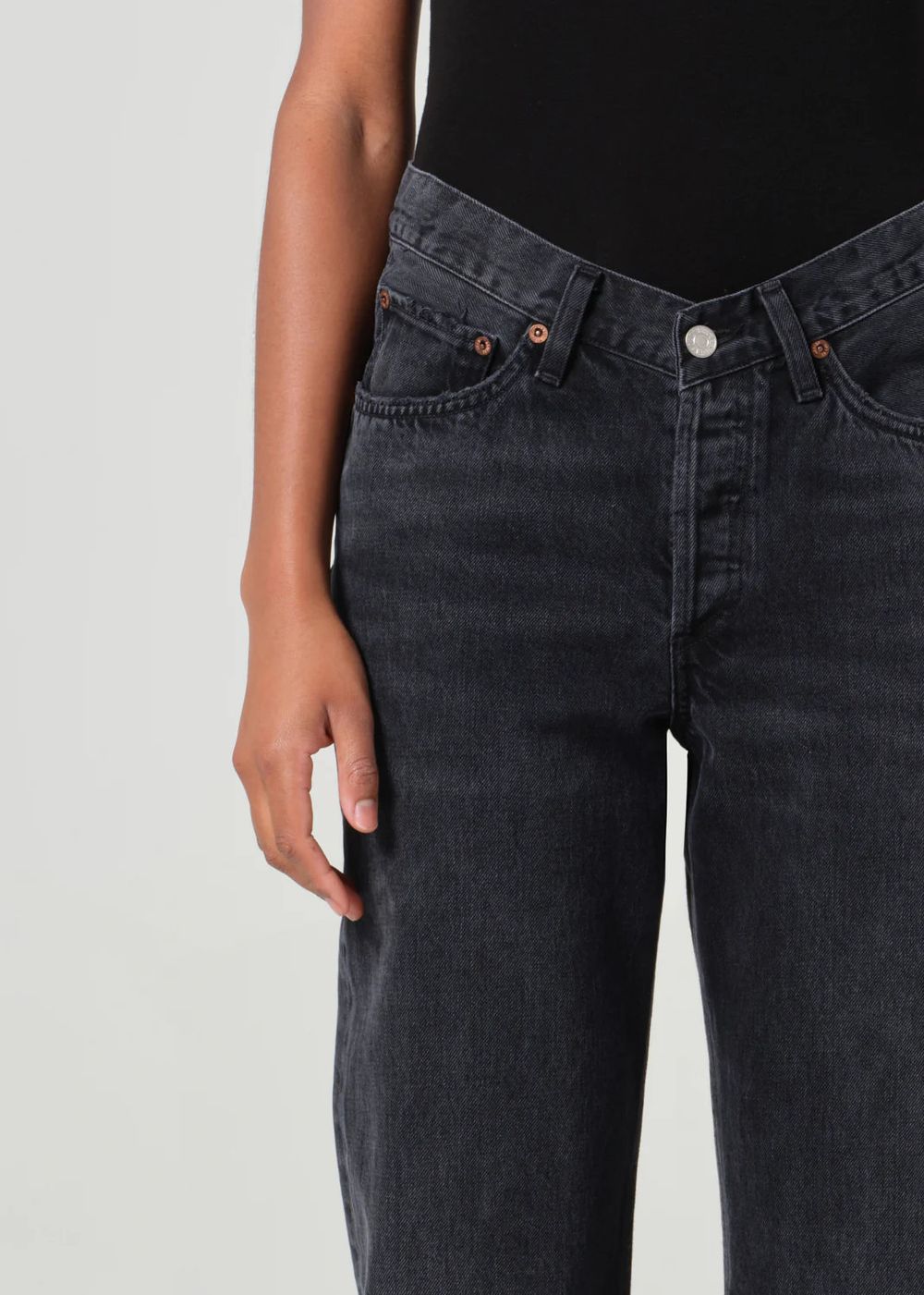 The V-Waist Kelly reimagines the iconic Kelly jean with a sharp, pitched V-waist for a flattering, sculpted fit. This design features a high-rise, relaxed straight leg and a vintage-inspired extended inseam, providing a perfect balance of comfort and chic appeal.