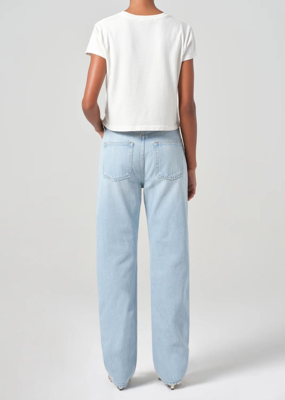 Introducing the Agolde Kelly Jean in Wave Wave, designed for effortless style and comfort. These jeans feature a flattering high-rise waist that leads into a relaxed top block, falling into a classic straight leg with a vintage-inspired extended inseam. Crafted from a blend of regenerative cotton and recycled cotton, they come in a pale vintage indigo color, showcasing natural fading and subtle distressing for a perfectly worn-in look.
