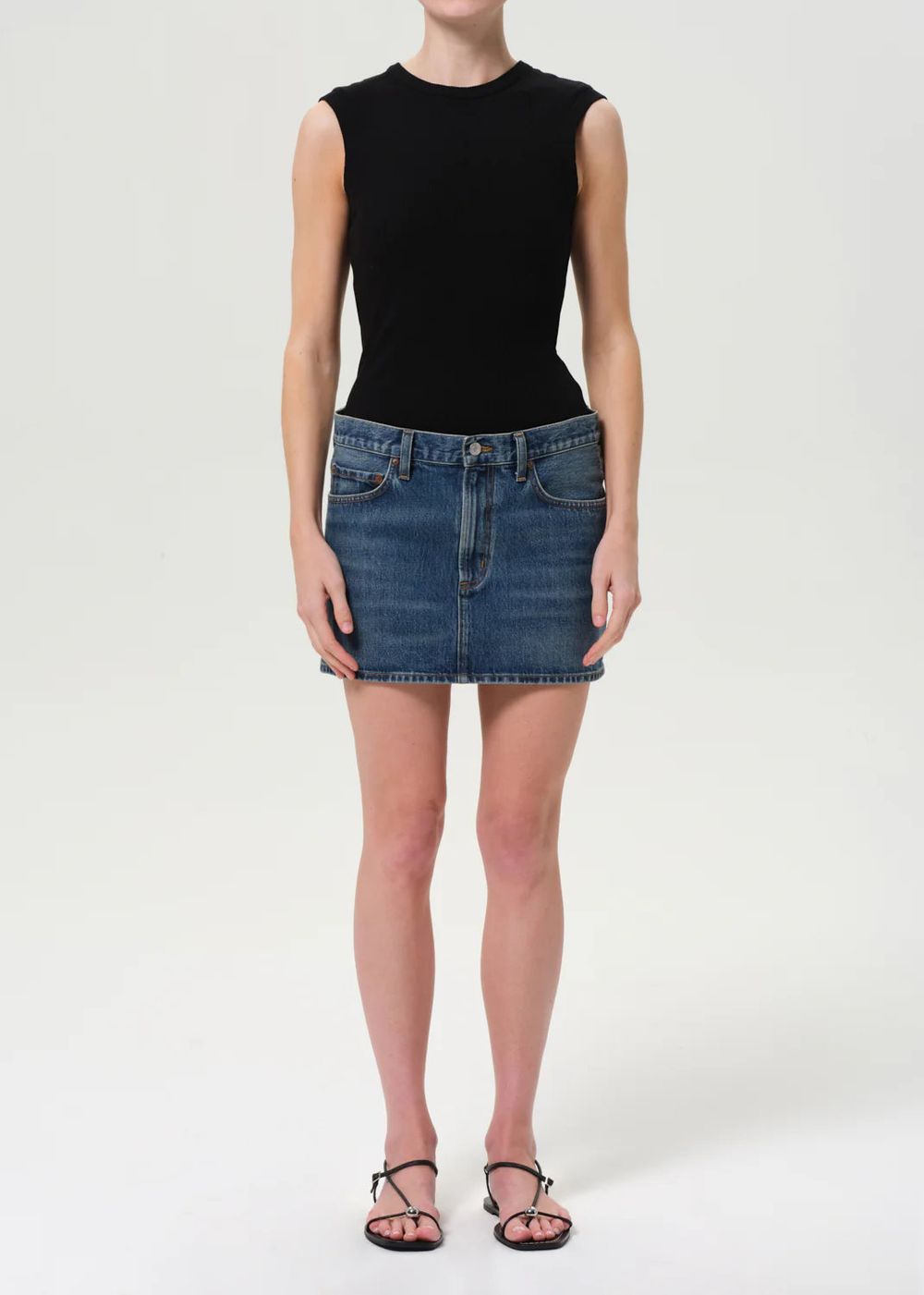 The Agolde Alek Mini in Dwell Dwell is crafted from our signature regenerative cotton, offering a sustainable choice in fashion. This mini skirt features classic 5-pocket detailing and a clean, finished hem, providing a timeless look that complements various styles.