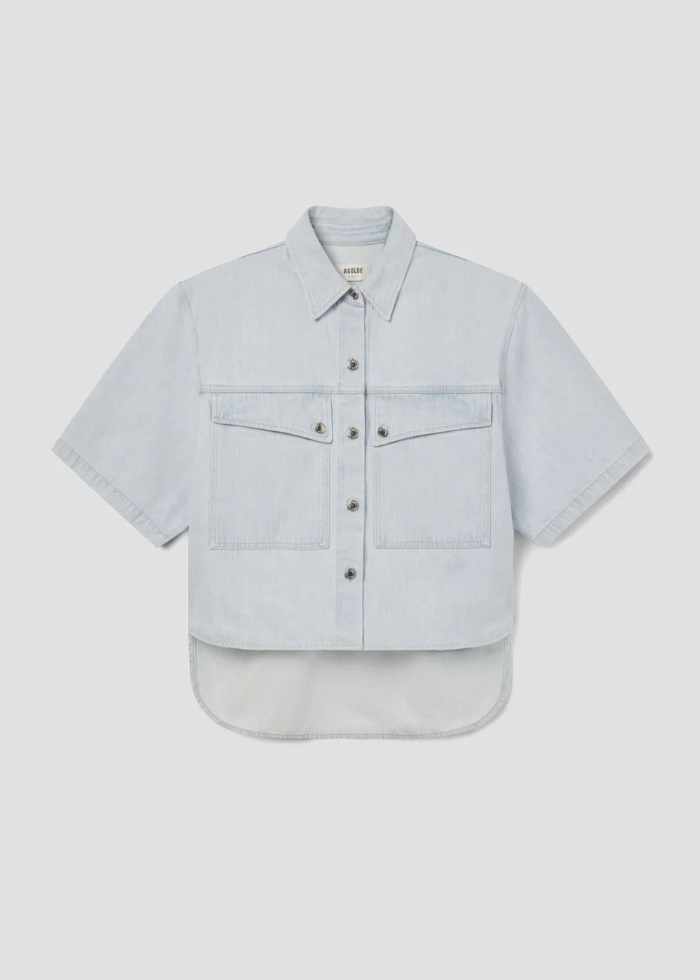 The Agolde Enora High Low Shirt is an oversized, boxy denim shirt designed for comfort and style. Crafted from regenerative cotton, this lightweight shirt is part of the Weightless Collection.